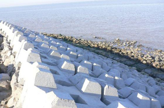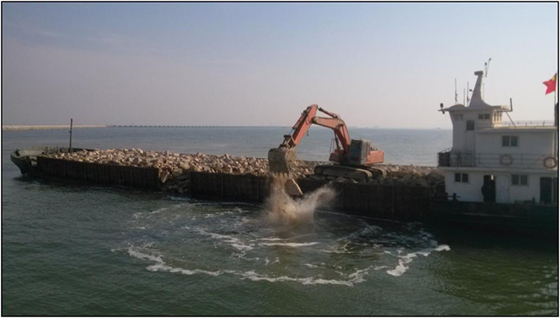 東營(yíng)港廣利港區(qū)位于萊州灣的西部、廣利河河口處,距東營(yíng)市城區(qū)約20km,東與膠東半島緊貼相連,西與濱州地區(qū)接壤,南與淄博、濰坊兩市相毗鄰,處在膠東半島和遼東半島的環(huán)抱之中。本工程位于廣利港區(qū)北作業(yè)區(qū)。本工程西側(cè)與廣利港區(qū)防波堤工程相連,東側(cè)至規(guī)劃初期口門,工程全長(zhǎng)5126m。其中4+444~8+065為直線段,軸線方位為251°—71°,長(zhǎng)度為3621m;8+065~9+570為折線段,軸線方位為259.5°—79.5°,長(zhǎng)度為1505m;兩段防波堤軸線夾角約為8.5°。本工程4+444~8+065為出水堤,堤頂高程為2.0m;8+065~9+570堤頂高程由2.0m漸變至-1.0m。