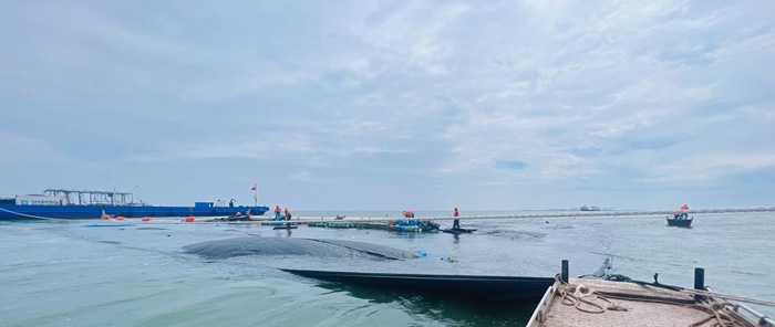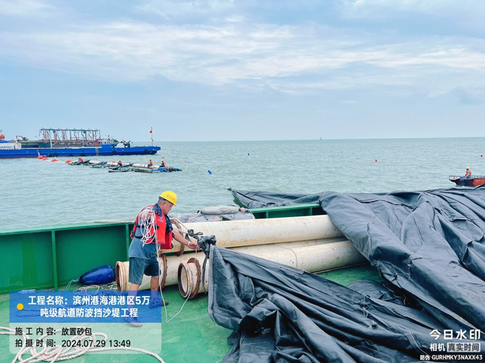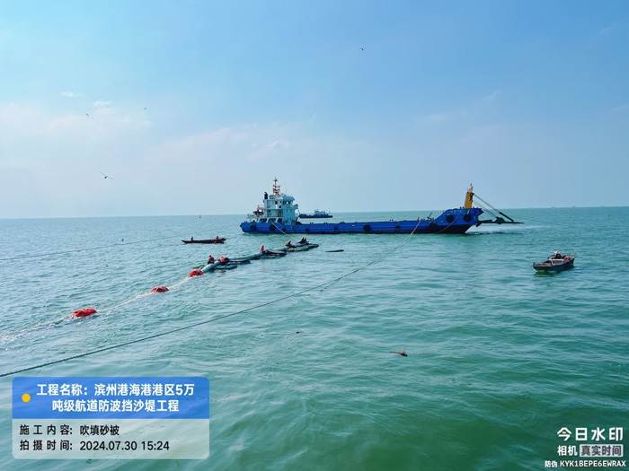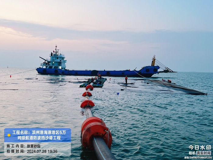 本工程位于山東省濱州市無棣縣濱州港區(qū),擬建的水工建筑物主要包括新建東西兩條防波擋砂堤,單堤長(zhǎng)度8800m,總長(zhǎng)17.6km。我司主要參建內(nèi)容:負(fù)責(zé)東堤1800米砂被吹填、土工布及土工格柵施工,里程為K2+200~K4+000。
